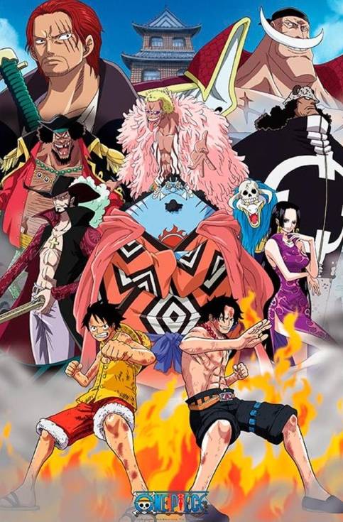 One Piece poster featuring Luffy and Ace fighting side by side. One Piece is a manga anime telling the story of Monkey D. Luffy and his pirate crew as they seek the One Piece treasure.